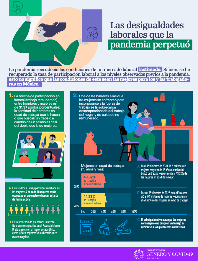 En el 1er trimestre de 2022, 17.9 millones de mujeres mayores de 15 años no trabajaron ni buscaron un trabajo —equivalente al 44.78% de las mujeres en edad de trabajar—. El principal motivo por el que las mujeres no trabajan o no buscan un trabajo es que se dedican a los quehaceres domésticos. Sin importar la clasificación económica de la población, las mujeres le dedicamos alrededor del doble de tiempo al trabajo del hogar y de cuidado no remunerado.