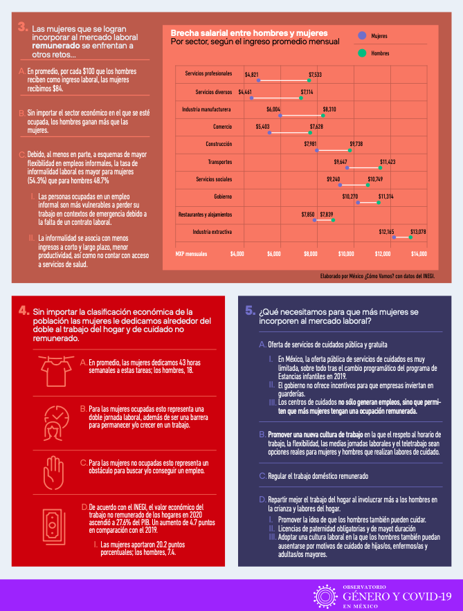 La brecha en razón de género es equivalente a 31.75 puntos porcentuales, esto se debe a la baja participación laboral de las mujeres: 4 de cada 10 están ocupadas en un empleo o buscan estarlo de forma activa. Una de las barreras a la que se enfrentan para incorporarse a la fuerza de trabajo es la sobrecarga desproporcionada del trabajo del hogar y de cuidado no remunerado.