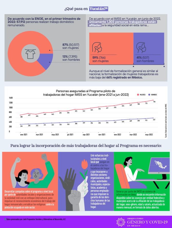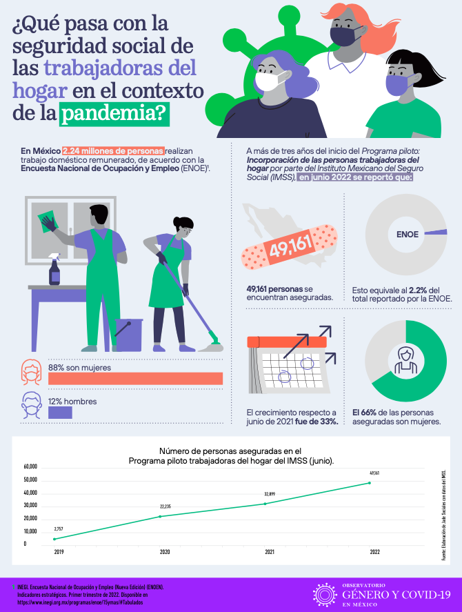 A más de tres años del inicio del Programa piloto: incorporación de las personas trabajadoras del hogar por parte del Instituto Mexicano del Seguro Social (IMSS), sólo 49,161 personas se encuentran aseguradas —equivalente al 2.2% de la estimación total reportada por ENOE.