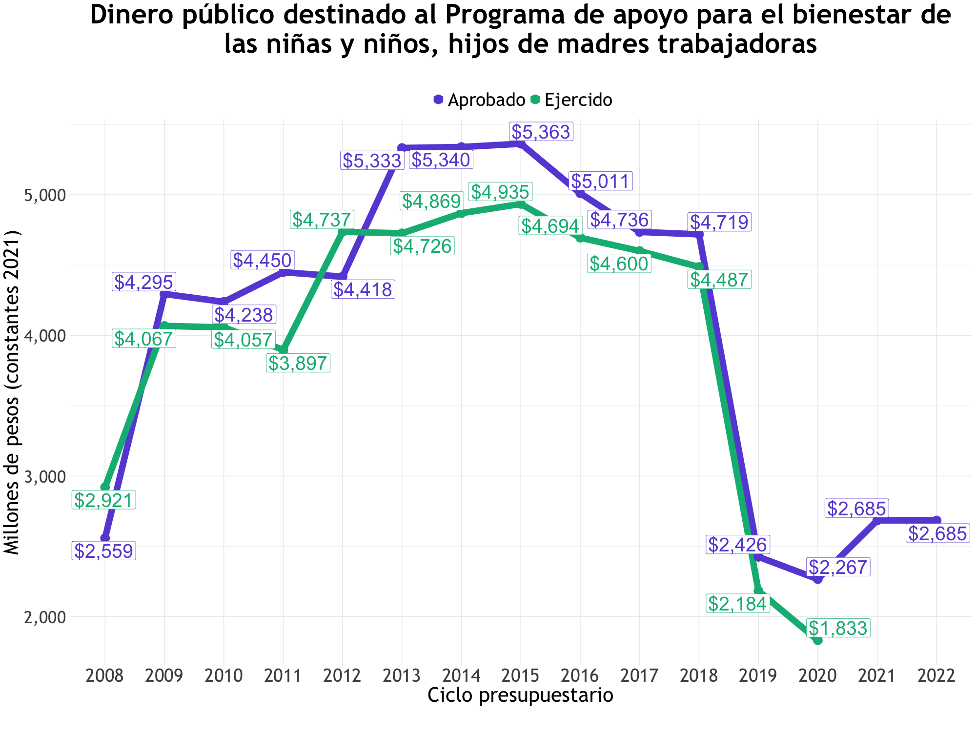 El Programa de apoyo para el bienestar de niñes, hijes de madres trabajadoras (antes Estancias infantiles), junto a las guarderías del IMSS, también benefician en el tema de niñas y adolescentes. La transformación de este en 2018 a un sistema de transferencias no condicionadas no sólo significó un cambio en el funcionamiento sino un recorte de casi el 50%. Aunque en 2021 recibió un pequeño aumento, el dinero público destinado al Programa de apoyo para el bienestar de hijes de madres trabajadoras se ha mantenido casi constante desde entonces. Dado que éste es el cuarto año de implementación, es necesario que se realice una evaluación de resultados para poder estimar si la nueva lógica del programa perjudicó o benefició a la población objetivo.